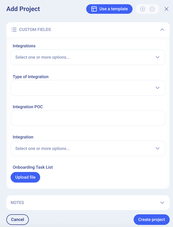 - Finally you can add or edit any custom fields or notes that apply to this project before finalizing the project by clicking the 'create project' button at the bottom left corner.