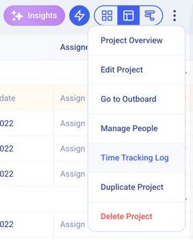 To view the time tracking log, go to the Project, and click the 3-dot menu and click "Time tracking log".
